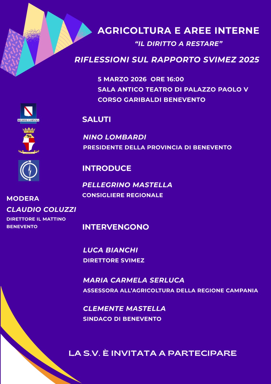 Si terrà giovedì 5 marzo 2026, alle ore 16.00, presso la Sala Antico Teatro di Palazzo Paolo V a Benevento, l’incontro “Agricoltura e aree interne. Il diritto a restare”, dedicato alle riflessioni sul Rapporto SVIMEZ 2025.