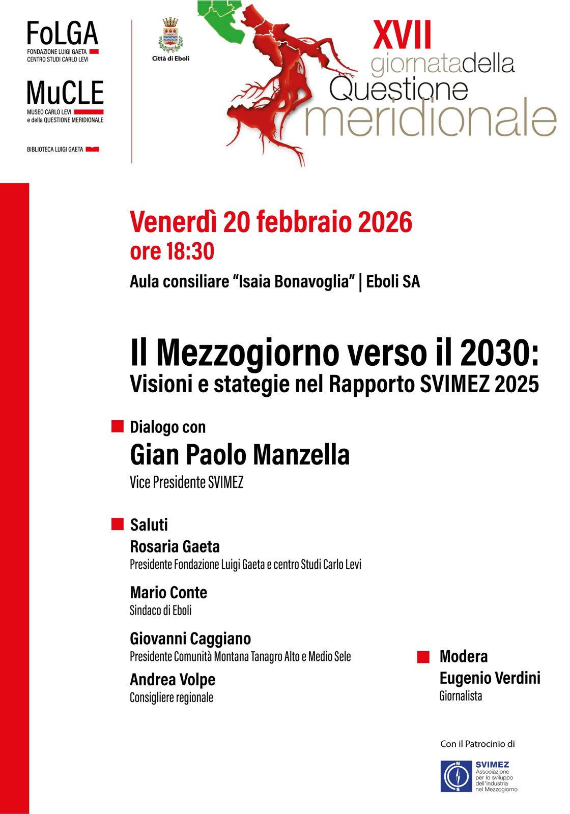 Nell’ambito della XVII Giornata della Questione Meridionale, venerdì 20 febbraio alle ore 18:30, presso l’Aula consiliare “Isaia Bonavoglia” di Eboli, si terrà un incontro di approfondimento dedicato alle prospettive di sviluppo del Mezzogiorno alla luce del Rapporto SVIMEZ 2025.
