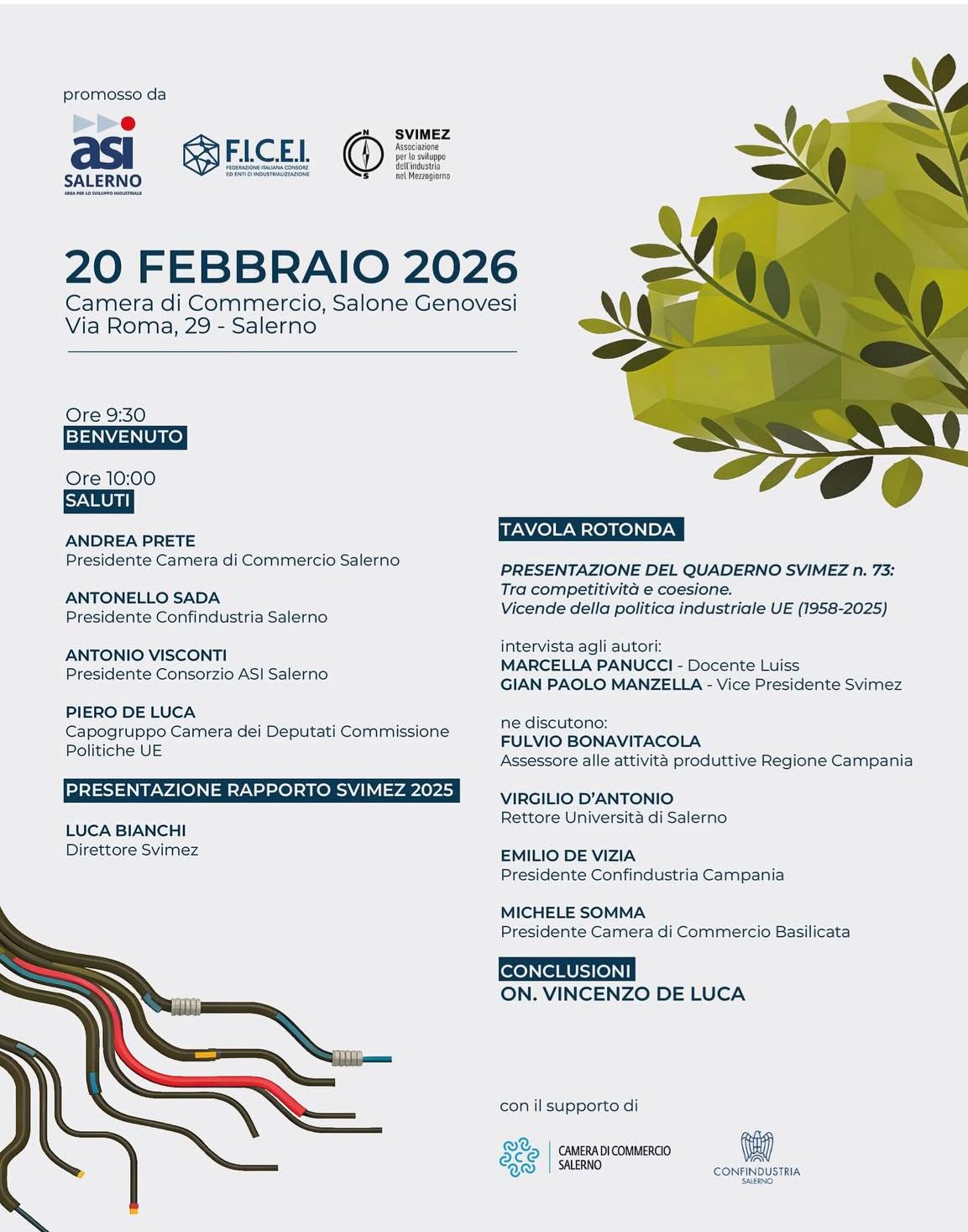 Venerdì 20 febbraio, a Salerno (Camera di Commercio, Salone Genovesi), ore 9.30, si terrà l’incontro promosso da ASI Salerno, FICEI e Svimez dedicato ai temi della politica industriale, della competitività e della coesione.