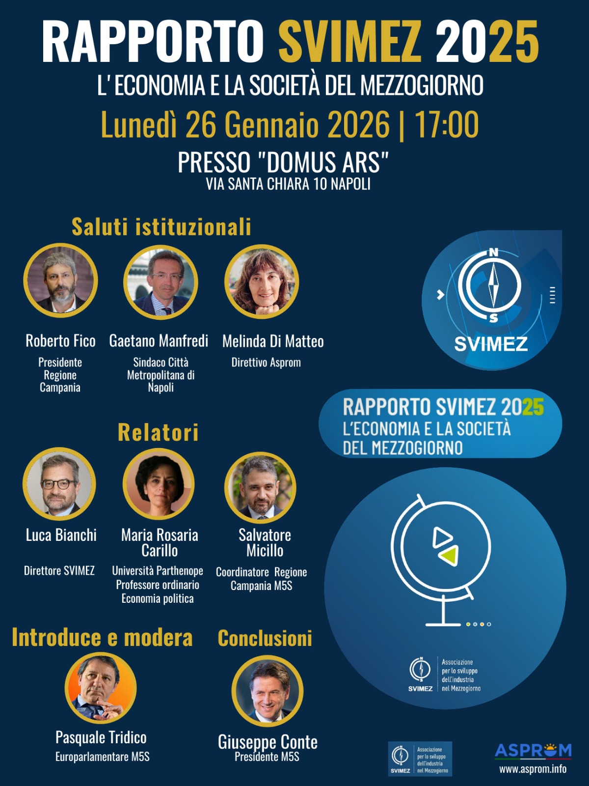 Lunedì 26 gennaio, a Napoli, il Direttore della SvimezLuca Bianchi presenterà il “Rapporto Svimez 2025 – L’economia e la società del Mezzogiorno”, nell’ambito dell’iniziativa promossa da Asprom (Associazione per lo Sviluppo e la Promozione del Mezzogiorno). L’appuntamento è fissato alle ore 17, presso la Domus Ars di Napoli.